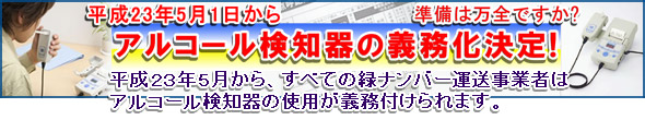 平成23年5月から、すべての緑ナンバー運送事業者はアルコール検知器の使用が義務付けられます。