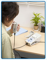 ハンディユニットを手に持ち、「測定ボタン」を押します。 吹き込み口にマウスピースを軽く当て、約3秒間息を吹き込むだけで測定できます。 測定結果は、表示パネルへ数値が表示され、プリンターから印字されて出てきます。 また、音声ガイド機能で安心して操作ができます。
