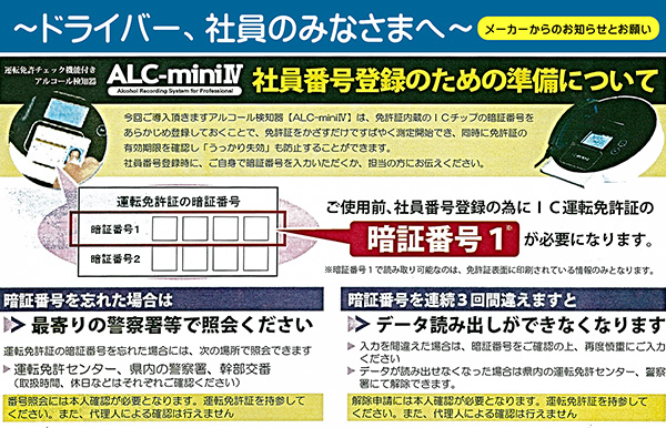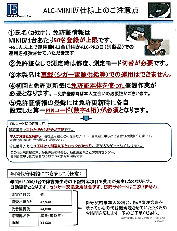 - 測定結果は内蔵プリンターで印刷。測定日時、結果、乗務員名、免許証の有効期限が印字されますので記録の保存に便利です。また、免許証の有効期限が出ますのでうっかり失効も防止します。