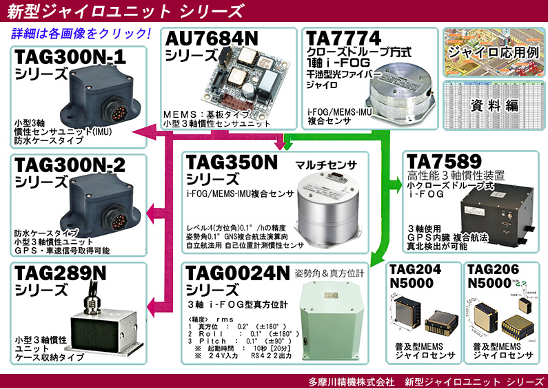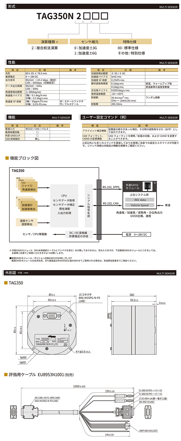 マルチセンサ3軸ジャイロ(Z軸にi-FOG、XとY軸にMEMSジャイロ)と加速度計で構成され、角速度、加速度を検出し、さらに姿勢角(ロール角、ピッチ角)と方位角を算出します。