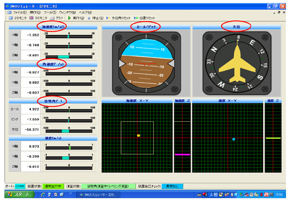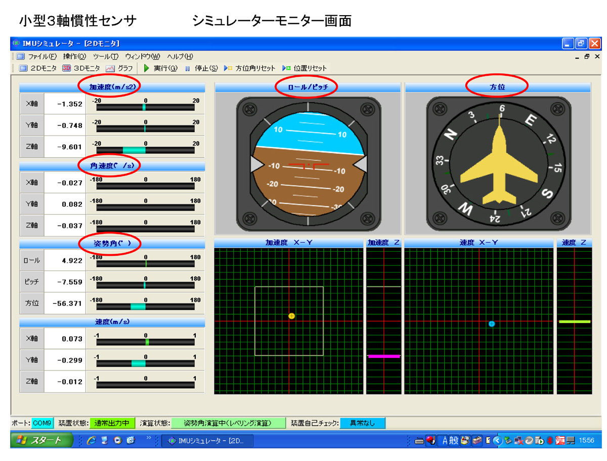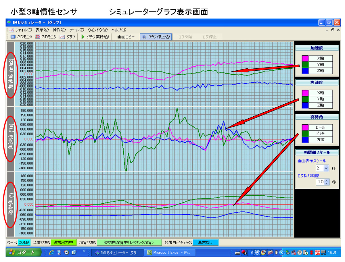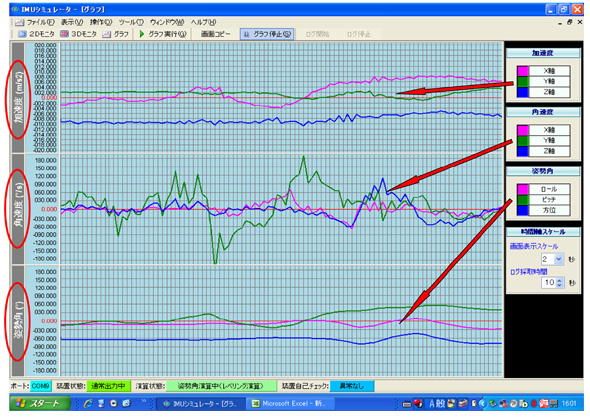 小型3軸慣性センサ シュミレーターグラフ表示画面