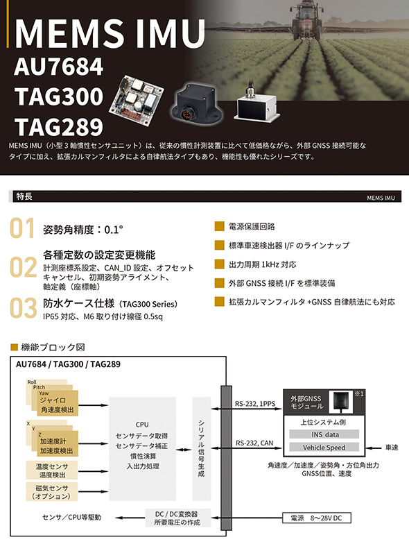 MEMS IMU (小型3軸慣性センサユニット)は、従来の慣性計測装置に比べて低価格ながら、外部GNSS接続可能なタイプに加え、拡張カルマンフィルタによる自律航法タイプもあり、機能性も優れたシリーズです。