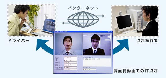 130万画素(ドライバー側のみ)、最高24コマ/秒の高画質動画でのIT点呼執行が可能。 音声と同時に管理者側のPCに自動的に記録保存されます。 回線は通常のインターネット回線(光ファイバ回線推奨)が使用できますので、ランニングコストも気になりません。