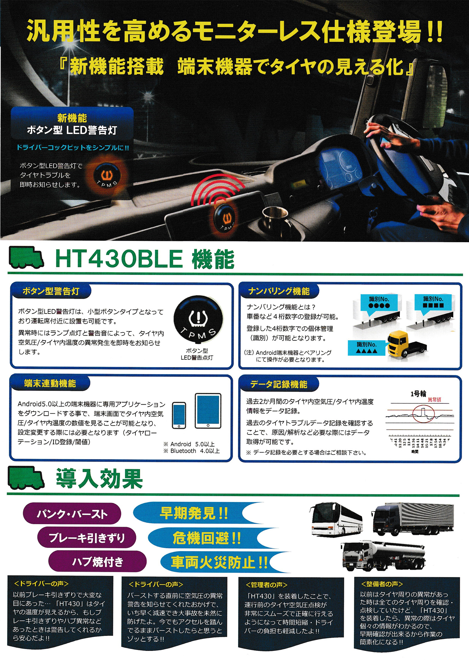 自動車は空気圧不足のままで走行すると、大幅に燃費が悪化したり、空気圧不足によりタイヤの変磨耗を引き起こします、TP Checker(TPチェッカー)を使用すると、リアルタイムでタイヤ内の空気圧や温度を把握出来るため、無駄な燃料消費が抑え、タイヤの寿命を長く保つ事が可能となります。 走行中のタイヤ空気圧と温度をチェック。 その安心がドライブする喜びへと繋がります。