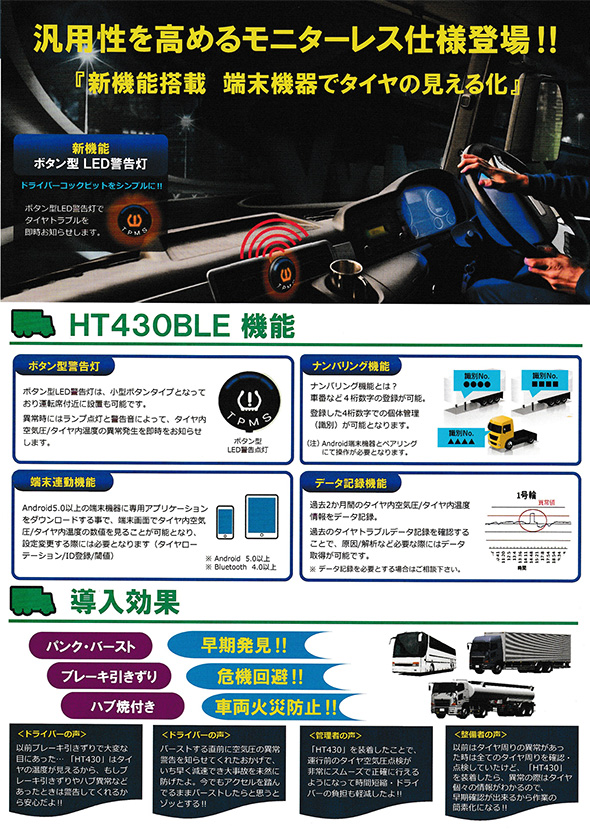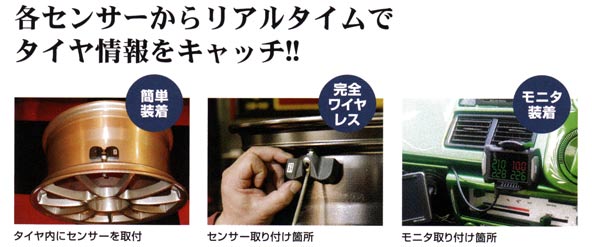 TP Checkerはタイヤ内に装着するセンサーで、タイヤ空気圧及び温度を運転席に装着したモニターに無線電波により送信。