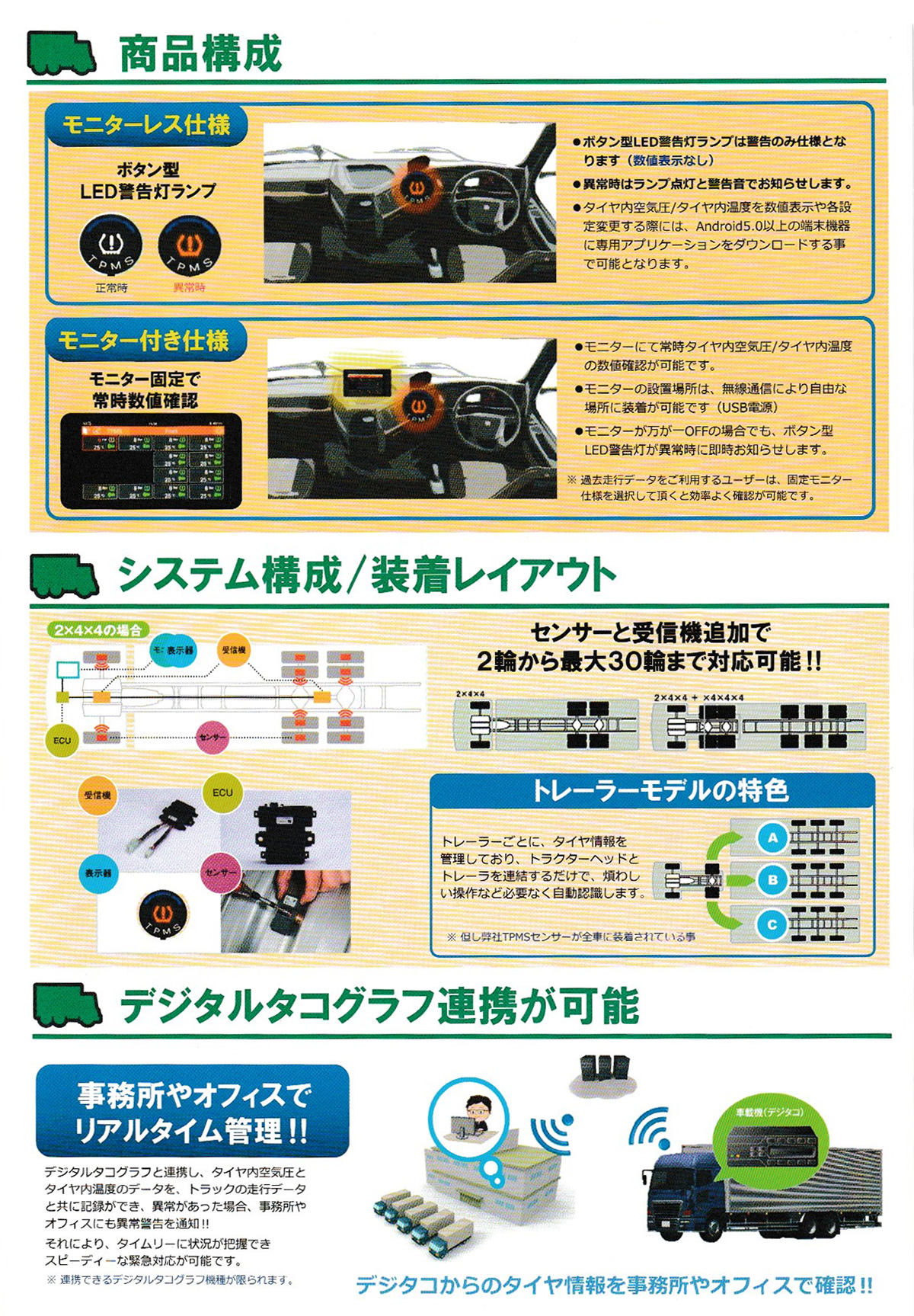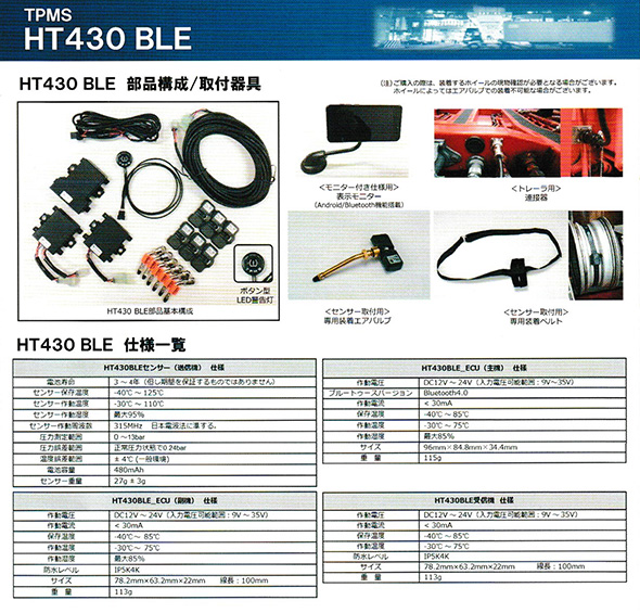 TP Checker(TPチェッカー)とは、タイヤ内部にセンサーを埋め込むことで、走行中のタイヤ空気圧と温度をチェックし、タイヤが危険な状態に陥った際にはモニターにて警告灯表示とワーニング音でドライバーへ知らせることで事故を未然に防ぐことができるものです。 TPMS=(Tire Pressure Monitoring System) TP Checkerは、ISO/TS16949の規格品です!