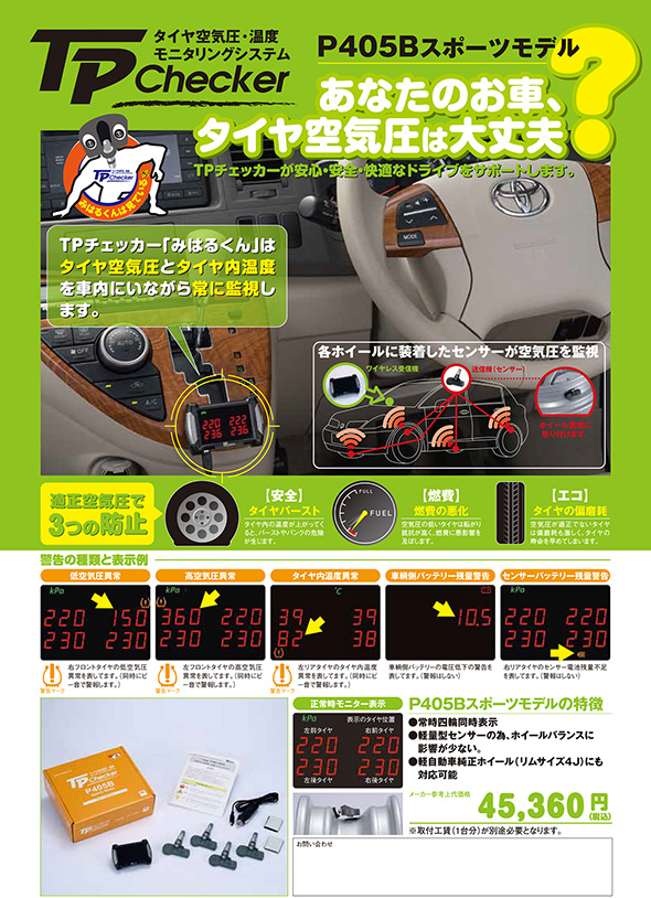 また、タイヤ内に装着されるセンサー送信機は大幅に小型・軽量化され、軽自動車などの小型ホイールでも装着が可能になり、ほとんどの乗用車への装着が可能です。