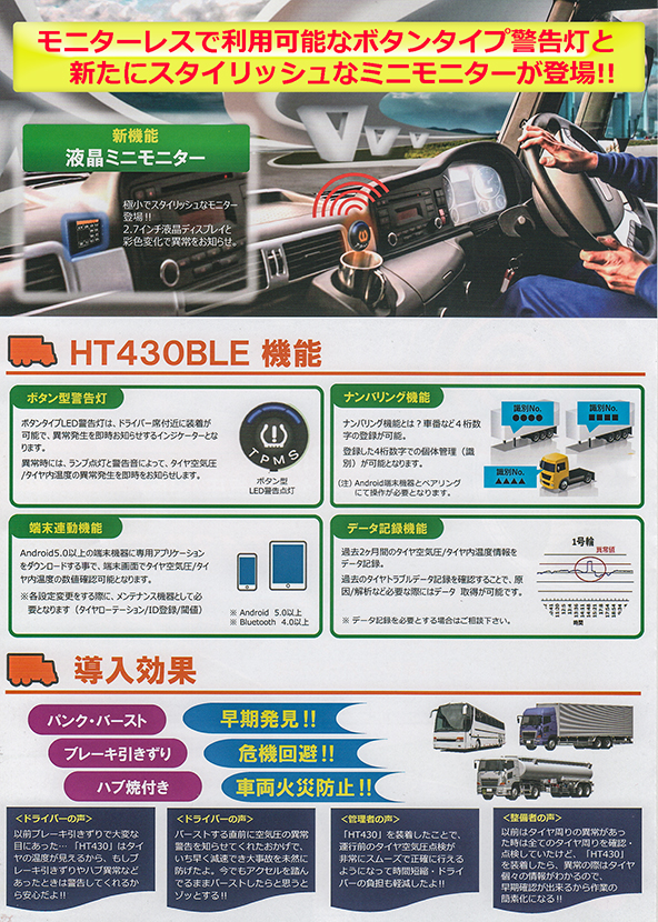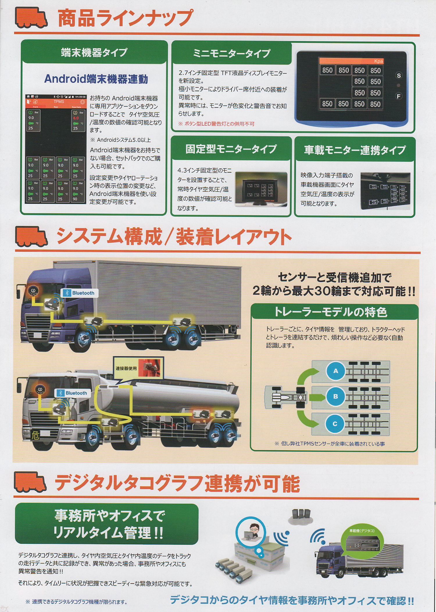 走行中のタイヤの状況をモニタリングする事により、バースト事故のリスクの低減や空気圧が減った事による燃費の悪化を防ぐ事ができます。