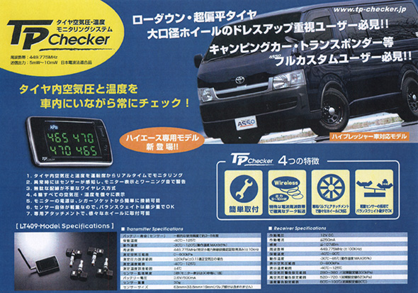 TP checkerはアメリカやヨーロッパで車への装着が義務化されている「TPMS」(タイヤ空気圧モニタリングシステム)をアフターマーケット向けに開発された商品です。